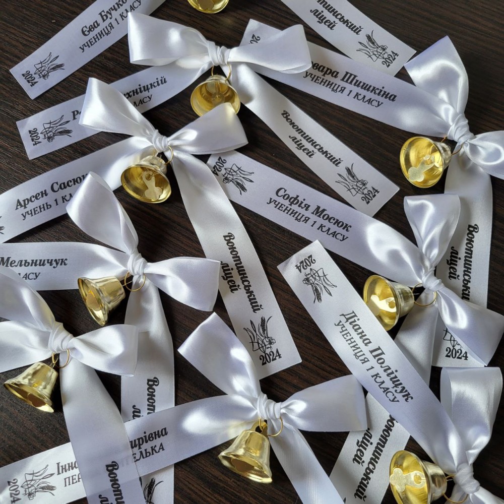 Додатково інтернет магазин "Випускний" пропонує Вам обрати не тільки  тон кольорів стрічок. У вартість не входить друк тексту на стрічках дзвіночка. На згадку про роки навчання можна додатково додати назву школи, клас, прізвища. Дзвоники для першокласників зберігатимуть особливу автентичну шкільну атмосферу свята довгі роки поспіль.