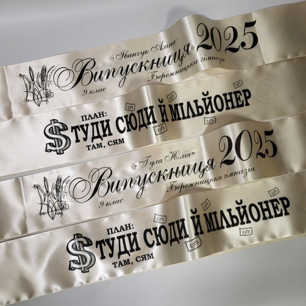 Наш магазин слідкує за трендами, тому ви можете безкоштовно додати у шаблон стрічки на випускний 2026 додатковий текст на спину стрічки. Якщо Ви бажаєте замінити текст на спині на свій, залишайте його у коментарях до замовлення. Будь ласка бутьте уважні, перевіряйте на помилки ваші тексти до оформлення замовлення. Вони не читаються, все копіюється. Надрукуємо на стрічках будь який ваш текст, що зробить ваші випускні стрічки повністю ексклюзивними. Друк на виворотній стороні цієї стрічки не робимо.