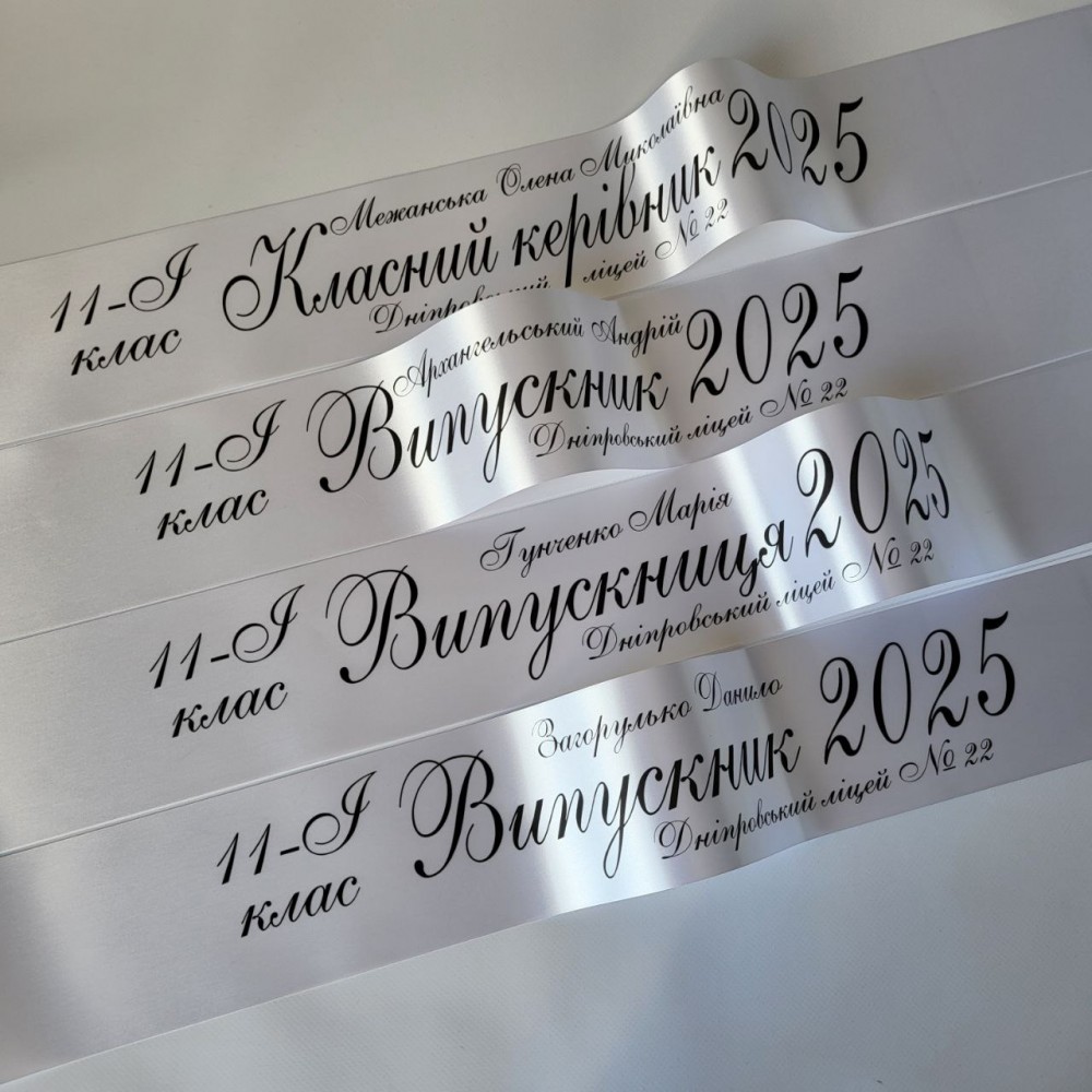 Пропонуємо купити стрічки на випускний 2026 у більше ніж 10 кольорах стрічки з різними кольорами надпису. В своїй роботі ми використовуємо професійне обладнання та преміальні матеріали, завдяки чому ваш клас буде найгарнішим.
