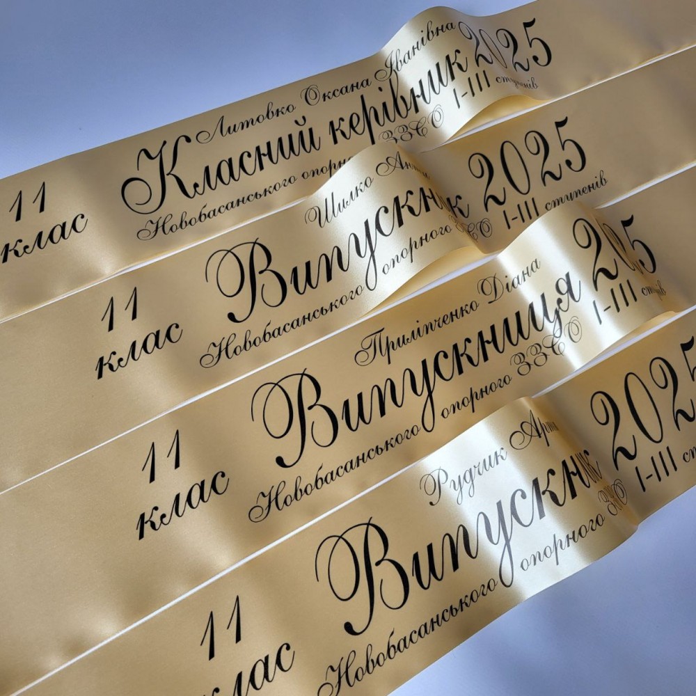Пропонуємо купити стрічки на випускний 2026 у більше ніж 10 кольорах стрічки з різними кольорами надпису. В своїй роботі ми використовуємо професійне обладнання та преміальні матеріали, завдяки чому ваш клас буде найгарнішим.