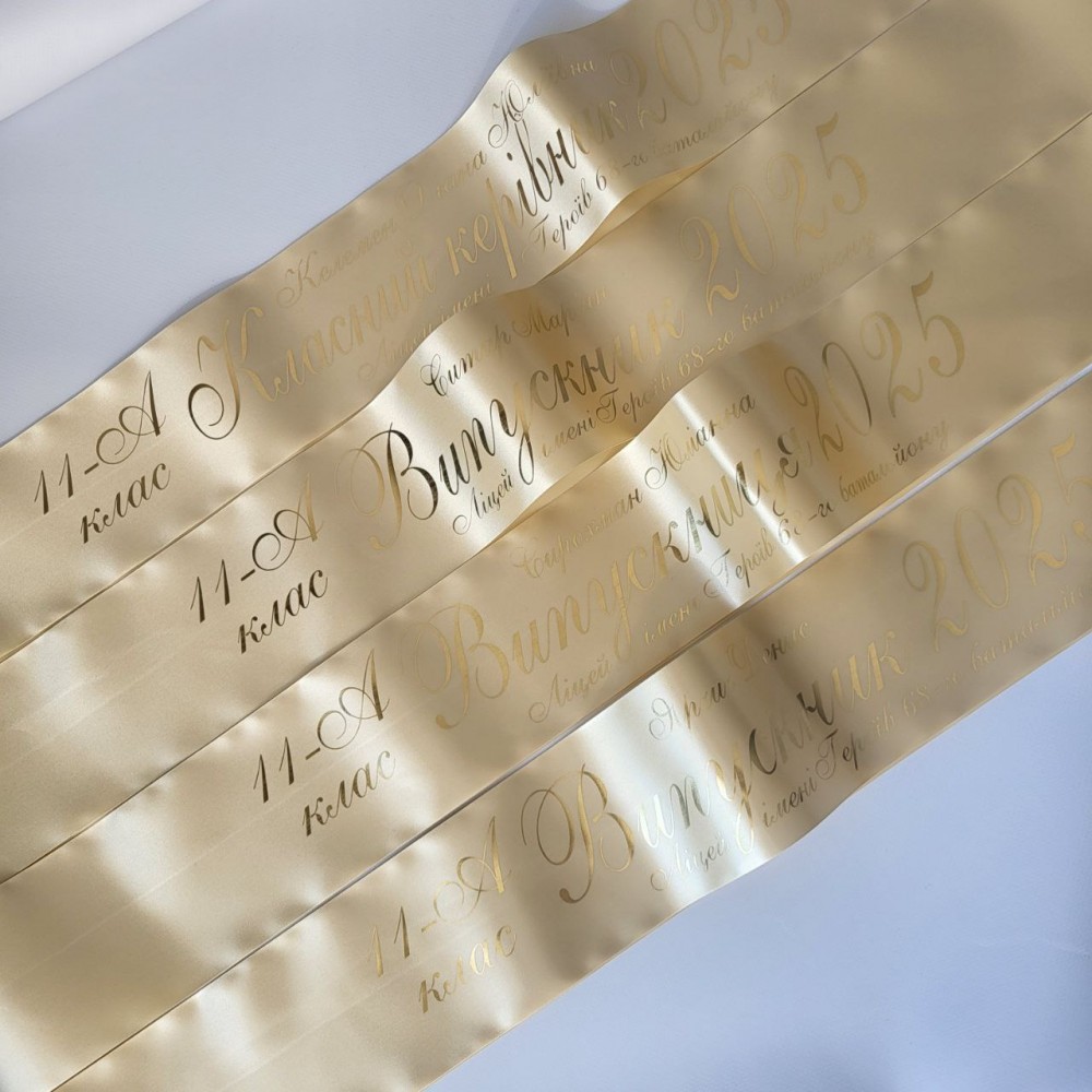 Пропонуємо купити стрічки на випускний 2026 у більше ніж 10 кольорах стрічки з різними кольорами надпису. В своїй роботі ми використовуємо професійне обладнання та преміальні матеріали, завдяки чому ваш клас буде найгарнішим.